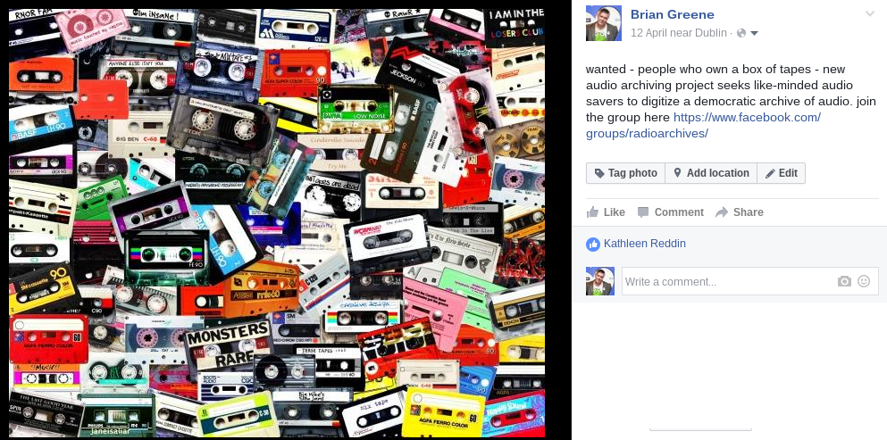 As part of my research I set up a Facebook group to gather people together with an interest in audio archive. It is easy to set up a Facebook group and easy to get people to join it. What is far less easy is to lead these people to work as a collective for a common good. While I was able to assemble a group of people interested in radio archives quickly with a small post about archiving cassettes from and old shoe box.